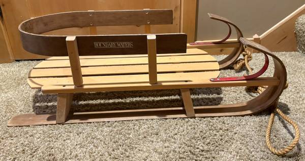 Boundary Waters vintage kids kinder sleigh dog tow Sled in excellent condition. This is vintage, and was used quite a bit at first, but has been stored a long time and is in excellent condition. Measures 33 x 16 x 11 inches. These were sold at Dayton's Department Stores back in the day.