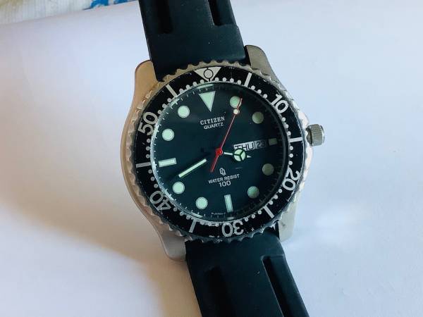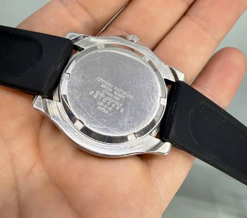 Silicone Black Band & Dial. Watch is preowned and in good working condition. Just replaced the battery and set the day/time.It's a daily wear watch showing signs of usage however still a good daily wear watch. See pictures for details and ask questions via email.