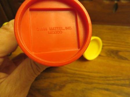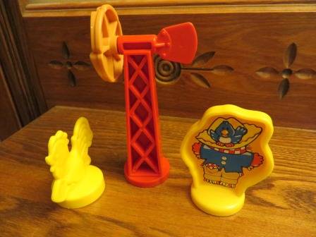 Mattel 1999 Animal Sounds Farm replacement parts. Windmill (red and brown plastic, 5 ¼" tall), scarecrow (figure on yellow plastic stand, 3" tall), and chicken/rooster (yellow plastic, 2 ½" tall)....