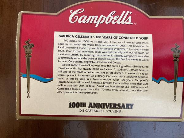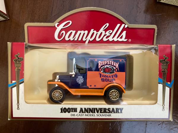 Campbell's 100 Year Anniversary Die-Cast Model Souvenirs 4 models from 100th, and 1 from 125th, 5 total Interested make an offer Cash payment Pickup in Apple Valley Contact through CL email