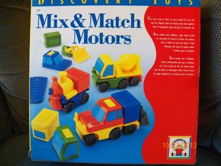 Discovery Toys Mix and Match Motors. 19 pieces make a car, truck, train, or dozer. Pieces mix up for creative play and stick together with magnets. Colorful play that increases dexterity. Ages 4 and up (but could easily be enjoyed by a younger child).