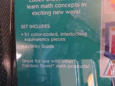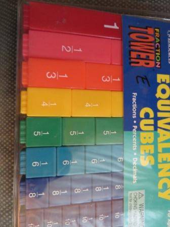 Learning Resources Fraction Tower Equivalency Cubes to help learn fractions, percents, and decimals. Item # LER 2509, for ages 8+. Set includes 51 color-coded, interlocking equivalency pieces and an activity guide. Brand new, sealed in original package. $10