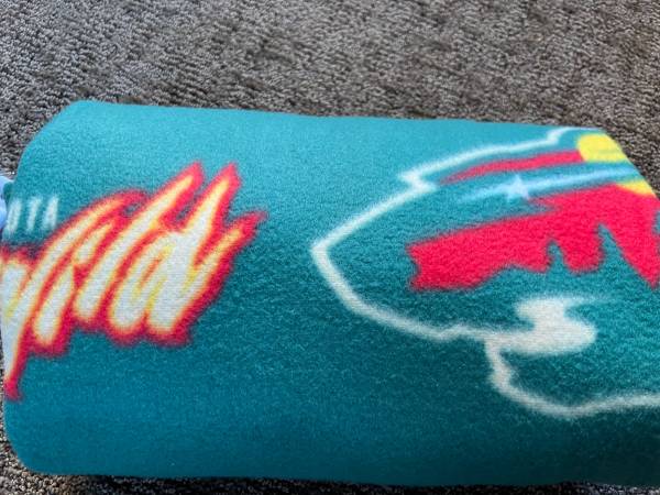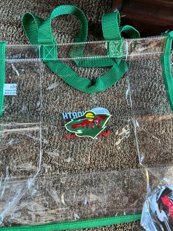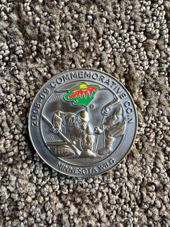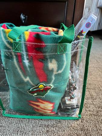 bag with 2014 playoffs greatest goals puck 2008-09 commemorative coin # 0916 of 5000 Key chain 2 knee hockey sticks mini helmet 6 hockey player figurines MN Wild Snuggly (wrap around blanket with...