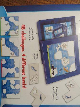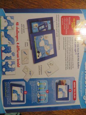 North Pole Camouflage: The Transparent Game. Logical, mind-challenging game for one player. 48 challenges in four levels, easy to expert. Storage compartment under the game board for puzzle pieces, challenge cards, and game guide with solutions. Brand new, sealed in box. $10