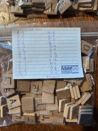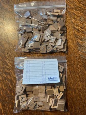 Scrabble tiles, natural tone wood. Complete set of 100 tiles. Have two of these. $6 each or both for $10 One other incomplete set, missing just two tiles. For crafts or to complete a partial set. $4