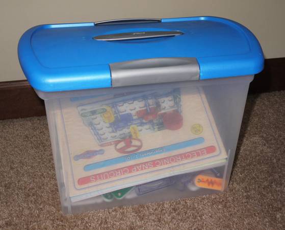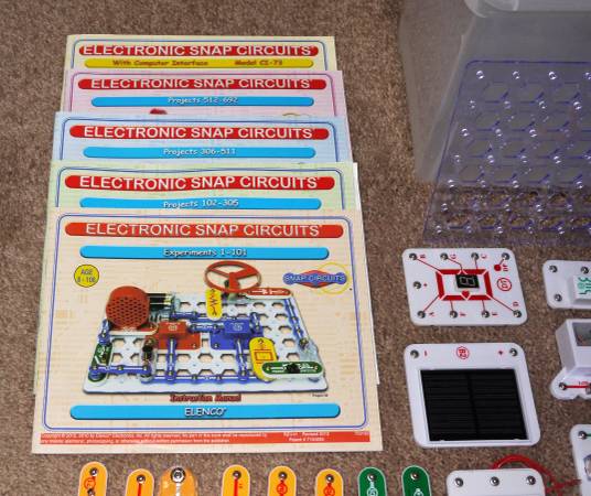 Elenco Snap Circuits Extreme SC-750 electronics lab set - complete with all components and instructions plus will include the storage bin pictured if you like (original box was flimsy and discarded). This set has been barely touched - my kids unfortunately did not take to it, but hopefully yours will. From a non-smoking home.