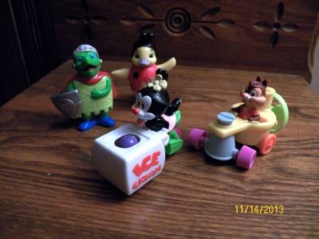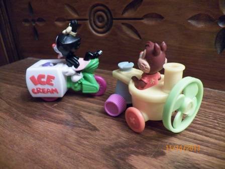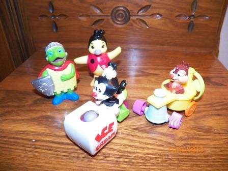 Warner Brothers - sister "DOT's Ice Cream Wagon" of Animaniacs. Sister "Dot" (a black and white kitty?) rides a cycle-driven white ice cream cart or wagon. As the cart moves, the ice cream moves up and down in the cart, giving Dot a lick each time. and One side of the cart says "Ice Cream" sign and the other side has an orange ice cream-on-a-stick picture. On the bottom is stamped "1993 Warner Bros"