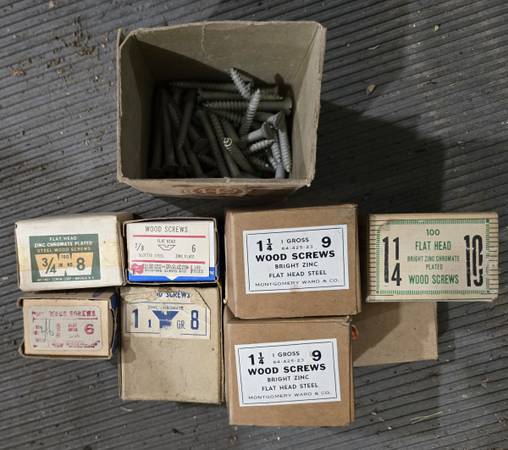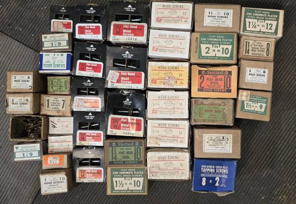 Assortment of plated flat head slotted wood screws. Most 100 size boxes are nearly full. Size 8 to 14, 3/4" to 2-1/2" long. New. Approximately 19# total.