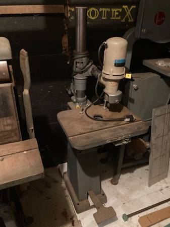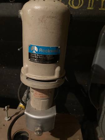 For your consideration is a 1970s Rockwell Delta Overarm router. These were advertised as being an overarm router, pin router, spindle carver, and shaper. The under table bracket (if you were to want to mount the motor under the table) has a break and would need brazing. Also the little cover is missing that goes over the gears that raise/lower the router head.