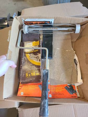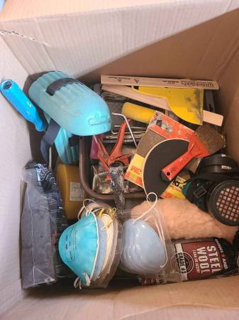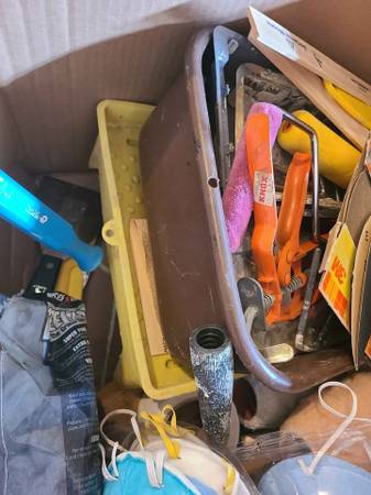 IF IT'S LISTED, IT IS AVAILABLE. Large box of painting supplies. Face masks, rollers, sand paper, brushes, pans, spackle tools etc. Pickup in Savage.