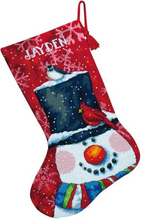 This adorable needlepoint Christmas stocking kit features a jolly snowman with birds perched on his top hat!