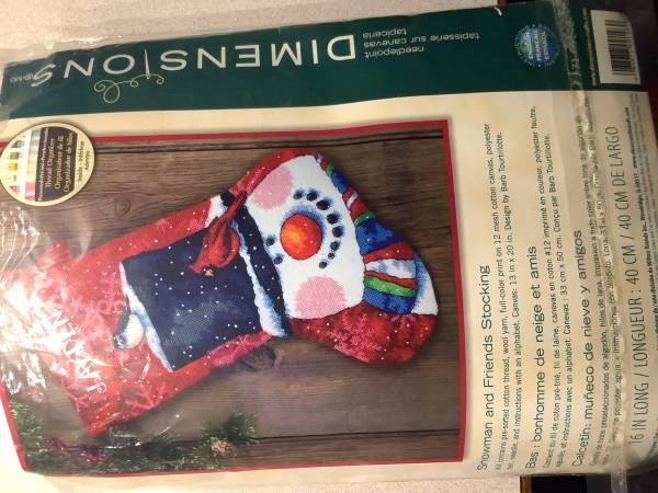 Snowman and Friends stocking kit includes presorted cotton thread, wool yarn, 12 mesh cotton canvas, felt backing, needle, and easy instructions.