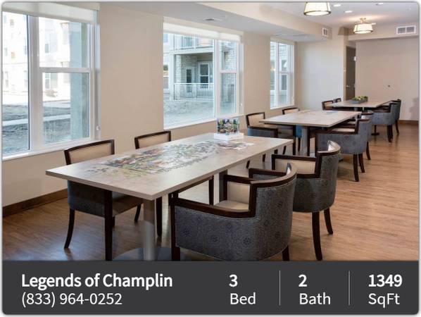 The Legends of Champlin participates in an affordable housing program. IMPORTANT: One household member must be at least 55 years of age, and all other members at least 40 years of age. Household income & student status limitations apply. The property has a minimum household income requirement of 2 times the monthly rent amount to qualify. The household income is based on GROSS annual income (before any deductions) earned from all sources includin