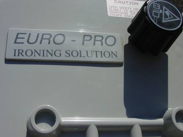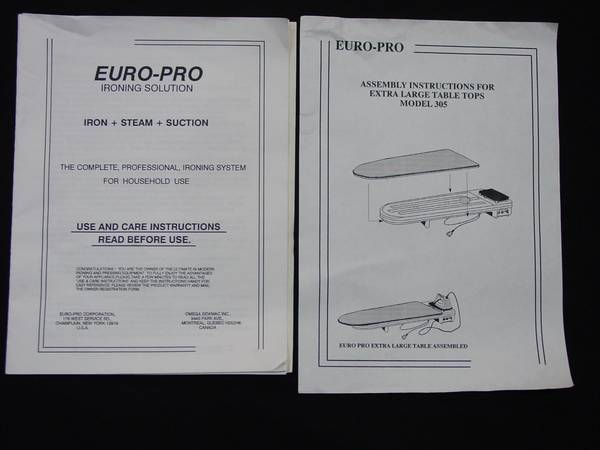 This is a Euro-Pro Ironing Solution, used very little and works well. It is an ironing system for household use. It irons beautifully with a thick soleplate iron offering constant steam release. It features suction which draws the steam through the fabric keeping it dry for a professional look. Note that the large ironing board is also included as seen in picture. Please see the pictures of the manuals for information. I no longer have need of this ironing solution but highly recommend it.