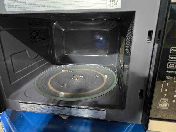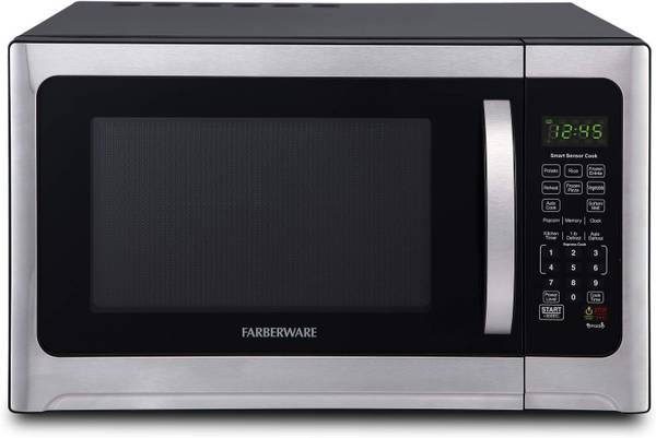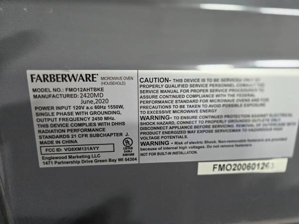 Farberware professional microwave oven. Brushed stainless stell and 1100 watts of power. Manufacturered in 2020 and purchased in late 2020. Barely used at office.