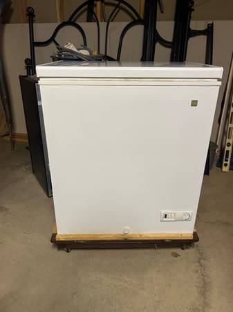 GE 5 cubic foot chest freezer/on wheeled cart, works well. CASH ONLY!!