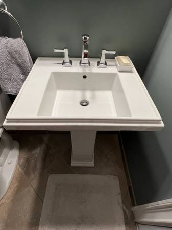 Slightly too tall for intended space. Drain NOT INCLUDED. Basin and pedestal in perfect condition, no faucet included, flat bottom drains within manufacturer's specification, trace water remains in basin.