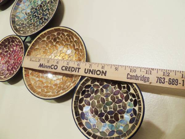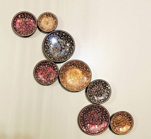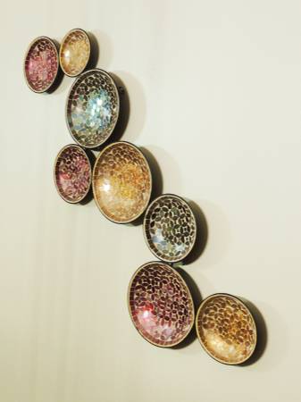 Gorgeous accent for any wall. I used it to bring color into a small space. Hue of color depends on your lighting. Photos were taken with flash. Piece measures 34" on diagonal as seen in one of the photos. This is a one piece unit. If interested, please let me know what time/day works for you and which of the following locations works, too;
