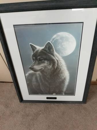 James Meger framed and unframed prints for sale Alpha - Timberwolf #441 Size framed and matted 27" x 33" Asking $550.00 Also have "Alpha - Timberwolf" print that is unframed Asking $300.00 Hidden...