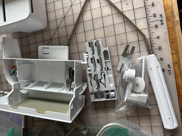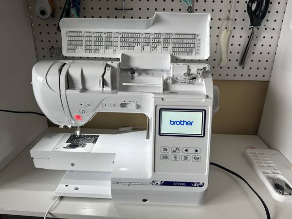 Awesome sewing and embroidery machine. I used mainly for sewing and embroidery for gifts. Hoops are 5x7, 4x4 & 2x2 Also includes a 5x12 re-positional hoop. Has knee lift for pressor foot. See...