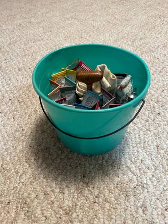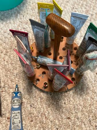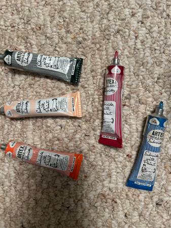 A pail of Artex roll on paint for fabrics, metals, etc. 20 tubes of assorted colors. All for $15.00