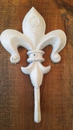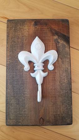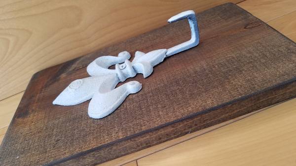 Fleur de Lis Single Wall Hook Cast Iron Painted White and Mounted on Dark Wood Measures 12 x 7 1/4 x 2 3/4 inches Handcrafted wall hook