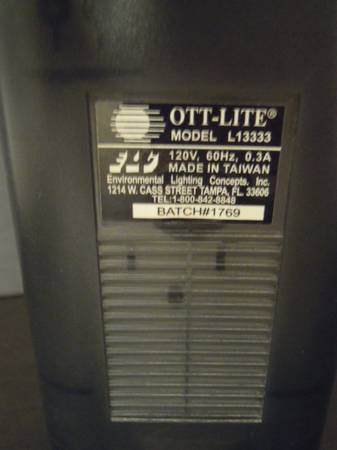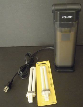 Ott-Lite Model OL13333 folding task lamp and 1 replacement bulb as shown (unopened bulb). 120V, 60Hz, 0.3A. Made in Taiwan. New, Unused.