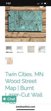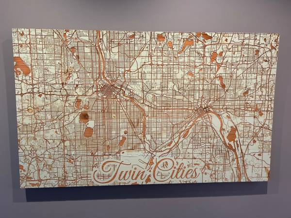 Laser engraved map on wood of Twin Cities. 57” x 34”