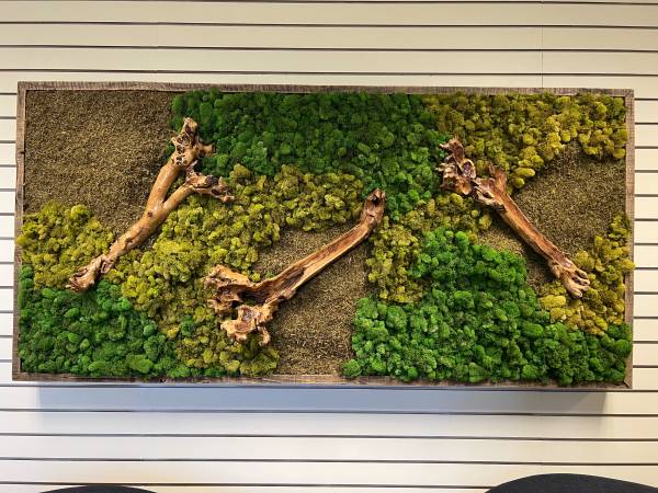Beautiful custom moss art work. Includes reindeer moss anmd sheet moss. Original barn wood frame. Must be able to pick it up from location. The art work is approx 30 lbs