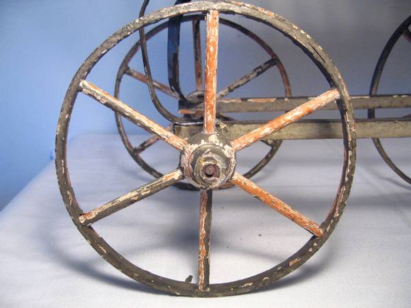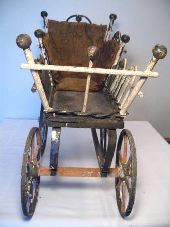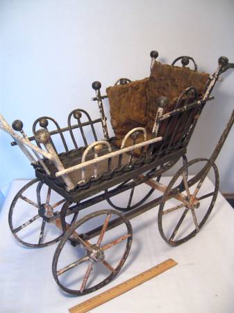 This is an all original antique Victorian wood doll carriage in the ball and stick pattern. The carriage has spoked wood wheels that move freely. The carriage has a silk tufted cushion and comes with a matching parasol.