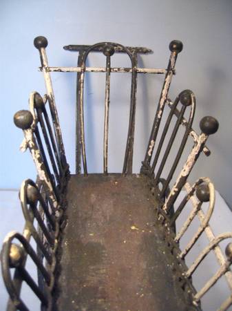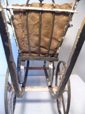 The carriage is in good condition with no cracks or defects in the wood. The silk fabric has deteriorated and is fragile on the pillow – the parasol fabric has shredded, but the spoked frame is solid. The parasol handle is missing from the carriage.