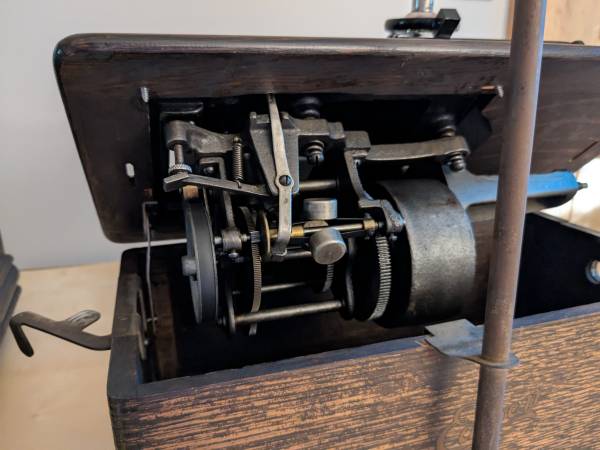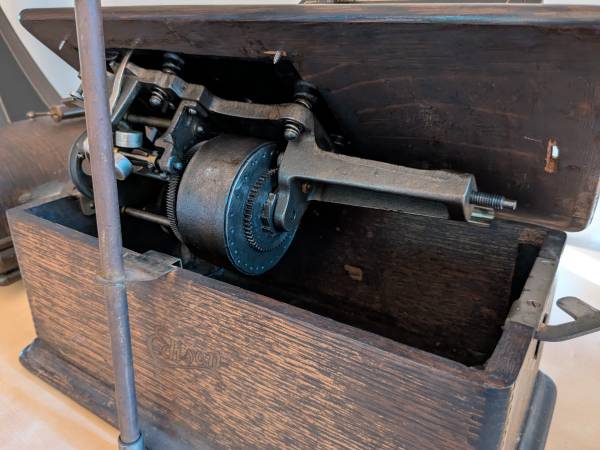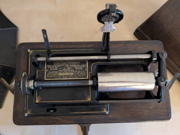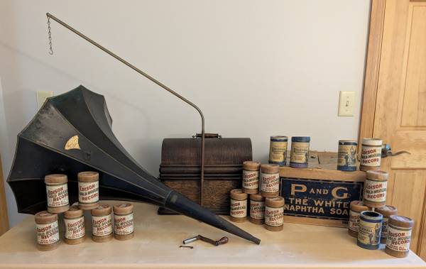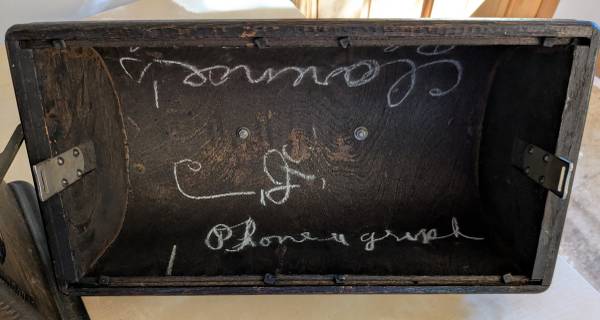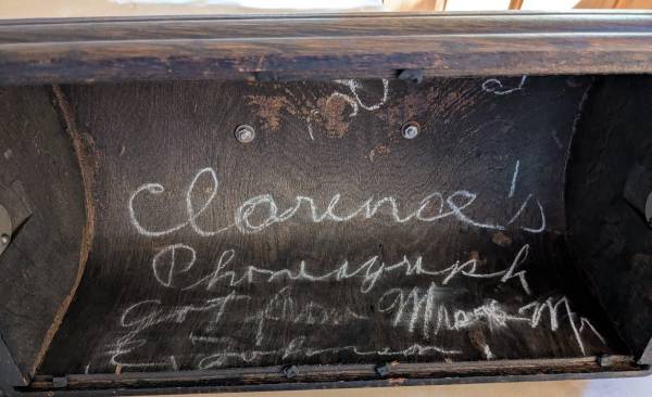 On the inside of the cover, there is a note written in chalk by my grandfather, who was born in 1913. “Clarence’s Phonograph got from Mrs & Mr E. Johnson” and “C.J.’s Phonograph”. I’m not sure who Mrs. & Mr. E. Johnson were, could be relatives. This has been in our family for at least 70 years as a display item.