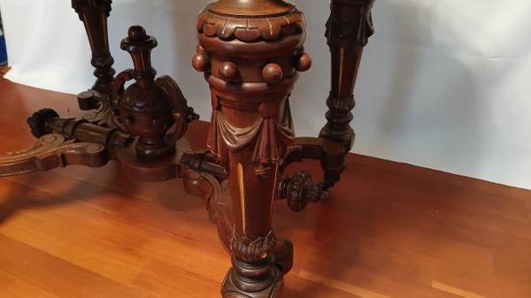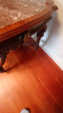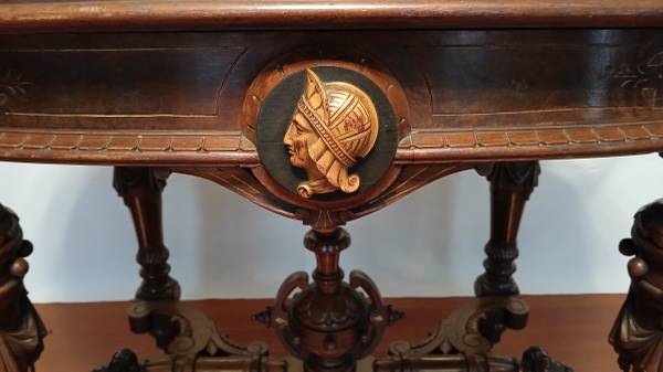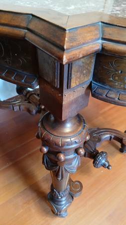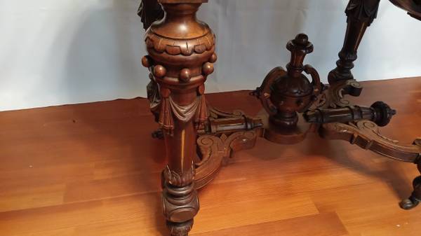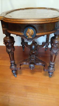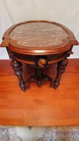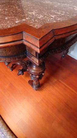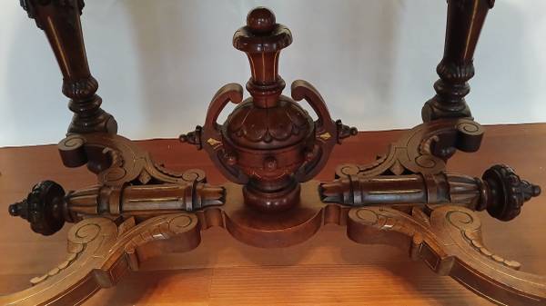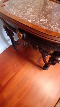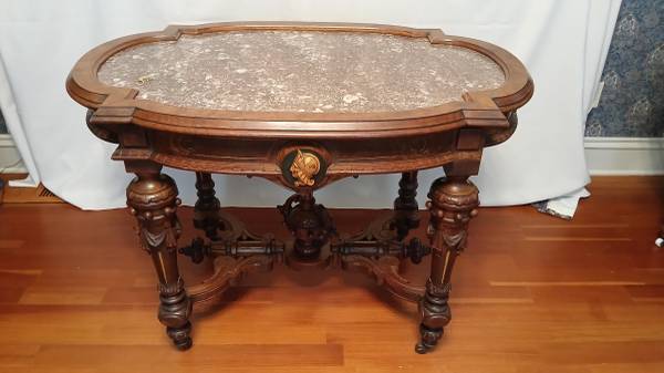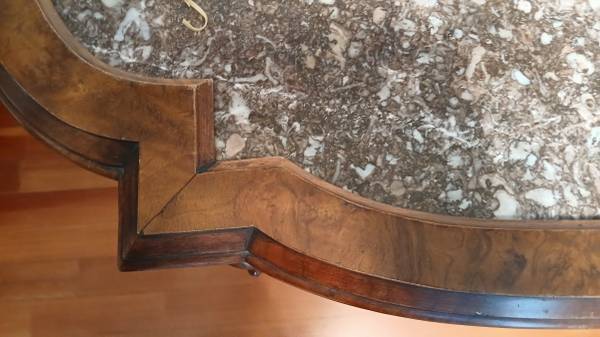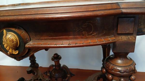 Gorgeous antique walnut, burl, and marble parlor table. Possible Renaissance Revival. Picture frame top with lovely brown marble. Intricate carvings of legs, aprons, and H stretcher areas.