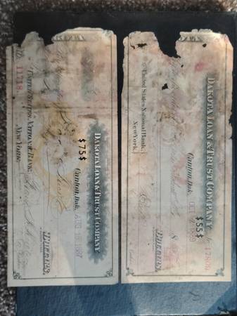 For sale is a small collection of five authentic checks from the late 1800s. The set includes two checks from Wells Fargo & Co., two from the Dakota Loan & Trust Company in Dakota Territory, and one from the Union National Bank of Chicago. These pieces of historical paper ephemera are well-preserved for their age, with natural wear that adds to their character. Ideal for collectors of Western Americana or banking history.