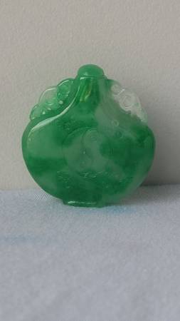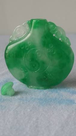 Selling a beautiful and rare Imperial Jade I Chinese snuff bottle. This piece is a genuine antique, hand-carved with intricate detail from a single piece of jade. It features a classic, elegant design with a natural jadeite stopper.