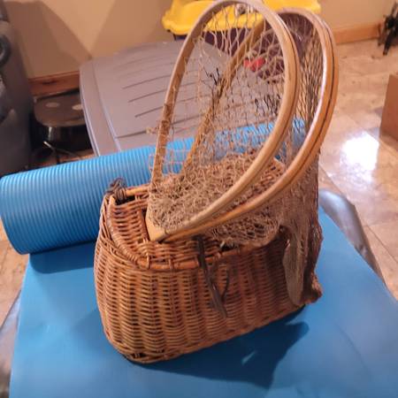 Antique Pair Wicker Fishing Basket & Fishing Net