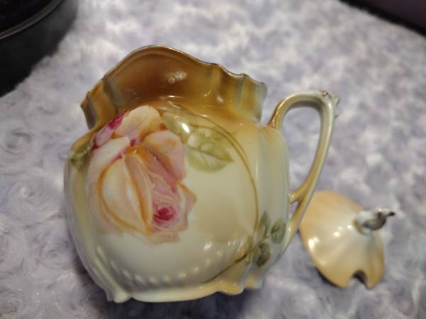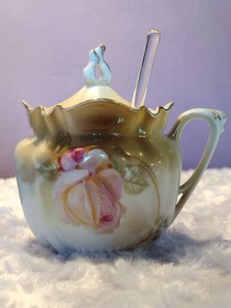 Circa 1910 Reinhold Schlegelmilch Mustard Pot w/ lid and glass spoon ladle. Made in their German factory. Hand painted white porcelain fading to pale green and orange with pink roses. Has a gold top rim with a gold spritz on the handle point and the lid spire.