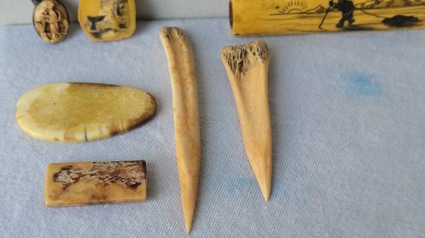 Extremely cool and interesting Scrimshaw pieces and assorted bone art! Found in a storage unit auction, I figured these pieces would be put to better use in the hands of collectors!