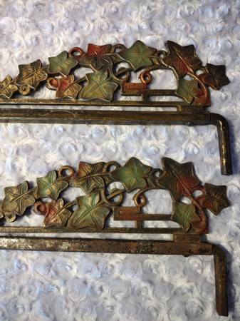 Pair of antique swing arm curtain rods with vining leaves in original red and green with gold highlights. Tops and end pieces still look great for their age, slide rods have some issues - paint scratches and some rust.
