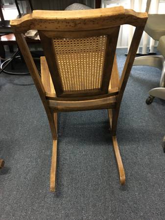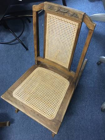 Built from what I believe to be wormy chestnut, this child's rocker is sturdy and comfortable, especially in warm weather, with its caned seat and back. I can't identify the style of the carved motif on the top rail of its back, but it evokes some classical types. It's been in storage for the last 20+ years.
