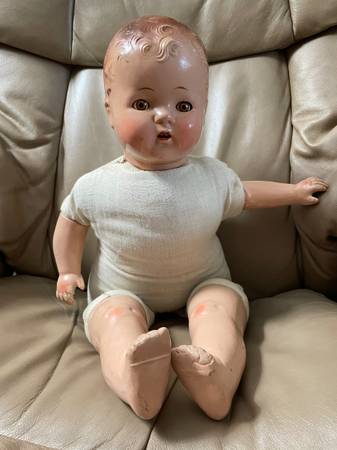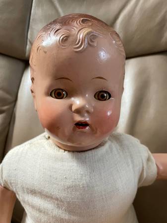 Vintage Composite Doll Estimate Years 1925-1945 Approximately 21 inches Head, arms and legs are composite Hair is molded in typical style of that era, eyes open, close and are brown See photos Cash...
