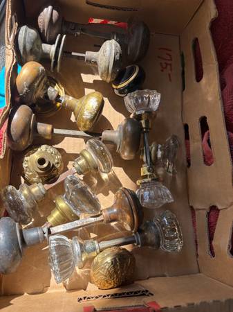 Whole box of vintage door knobs and hardware prices to sell. A great price.