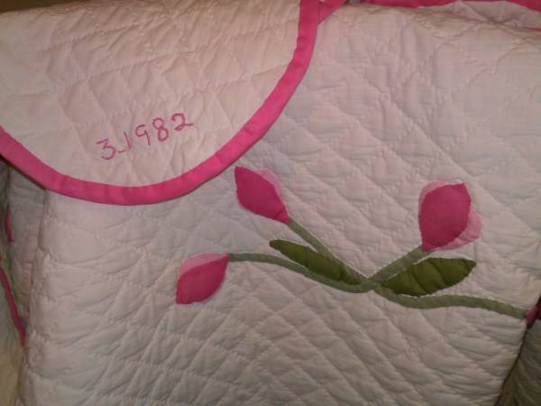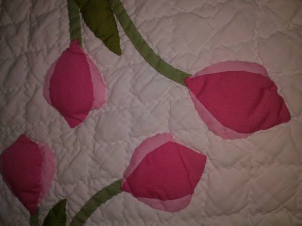 This beautiful quilt has never been used so is in excellent condition. It was made by the ladies in my mom's church and their work is impeccable. With children, it seemed best to store it, considering its value. So it was stored at my mom's house in a cotton pillow case so there's no fading, mildew or discoloration, -in a smoke, fragrance and pet-free home. It's 86" x 98" so can be used alone on a queen bed or with a dust ruffle on a king-sized bed.