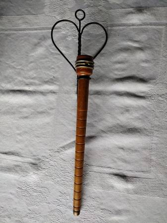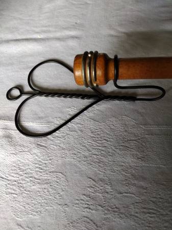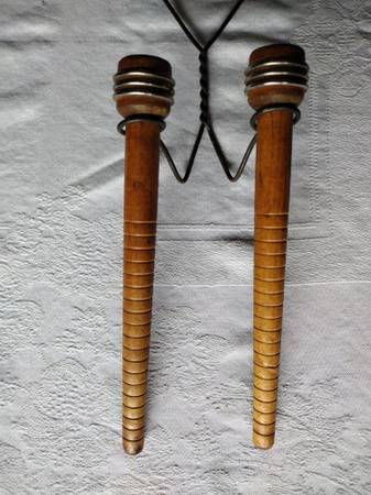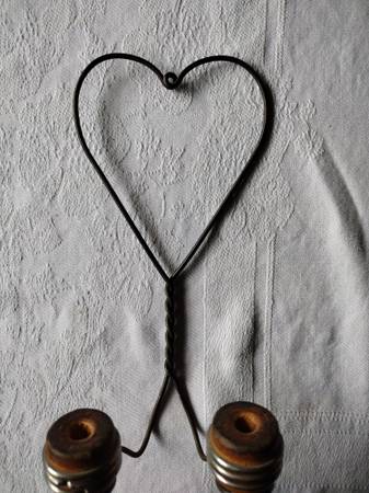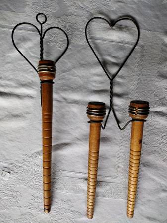 3 Vintage Antique wooden spools, industrial textile mill thread bobbin/spindle in heart shaped wire wall hangers.
