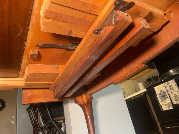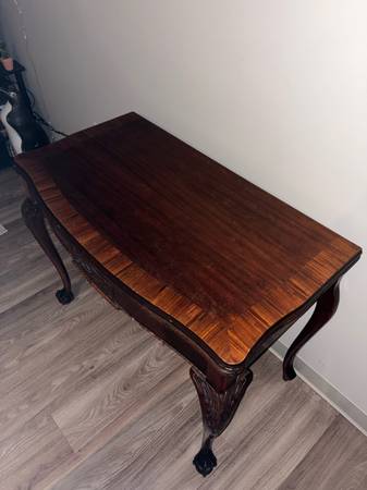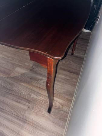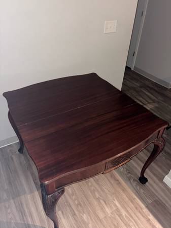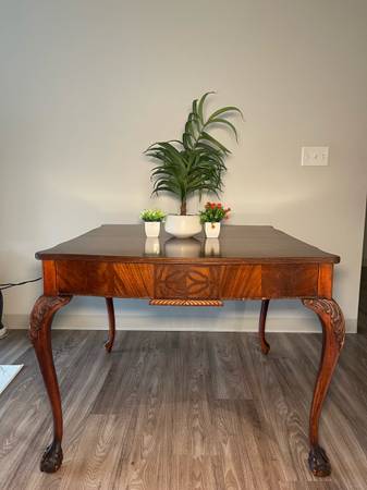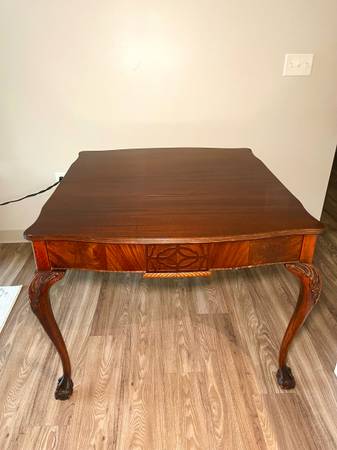 craftsmanship in rich, dark wood with a deep patina. The table features a smooth, glossy top with a drop-leaf design that expands for dining use, supported by gracefully curved cabriole legs with intricately carved details and claw-and-ball feet.