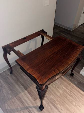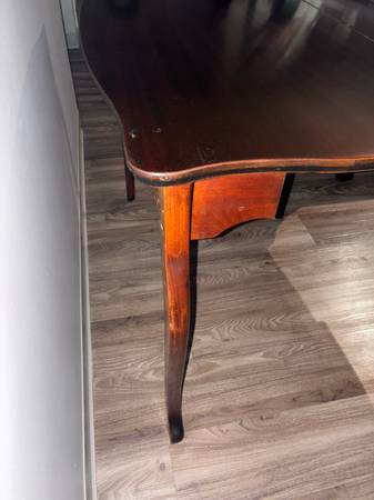 The apron is adorned with ornate carvings, including a central diamond motif, adding to its timeless sophistication. Perfect for both functional dining and stylish display, this versatile piece embodies classic Queen Anne elegance. A few historic scuffs showing a well-loved piece of family furniture