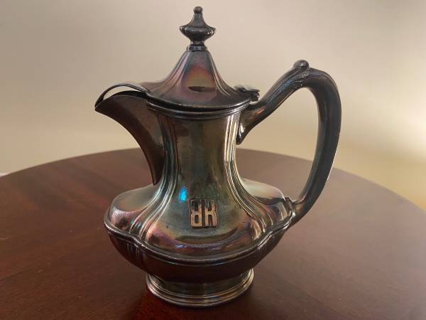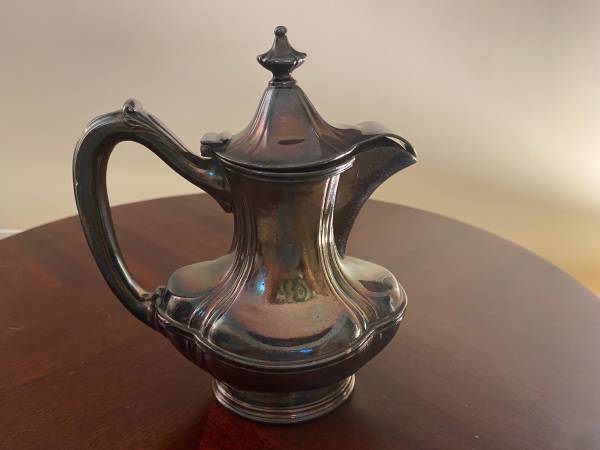Antique Reed & Barton silver soldered creamer. Markings on bottom 0199-H. 6 1/4” tall.