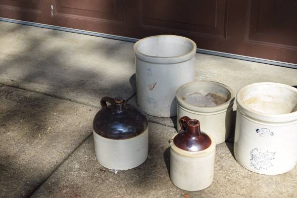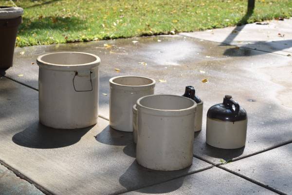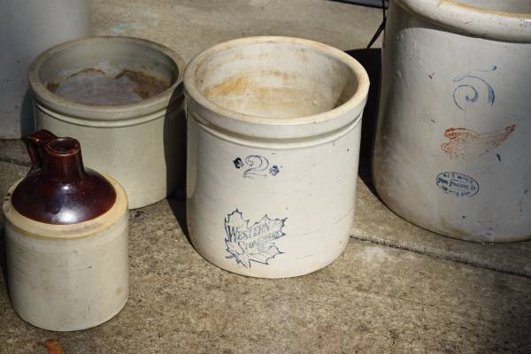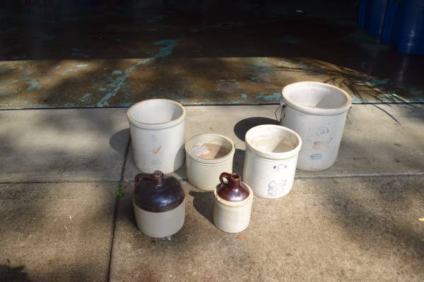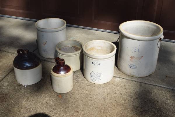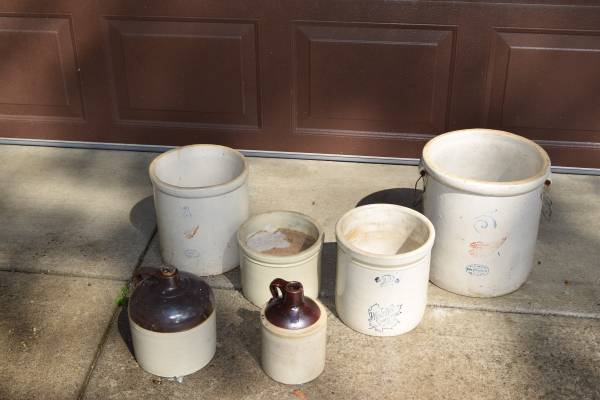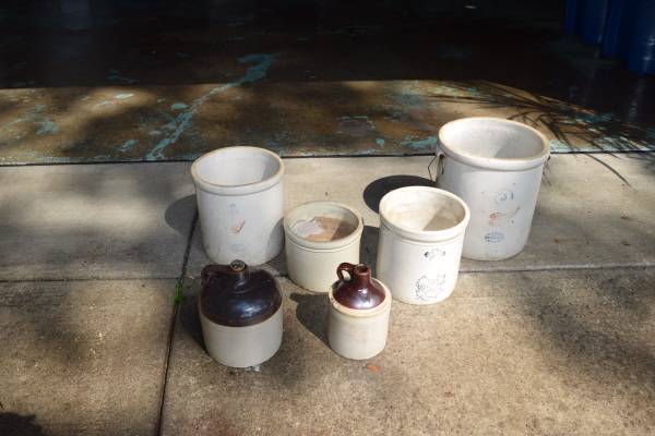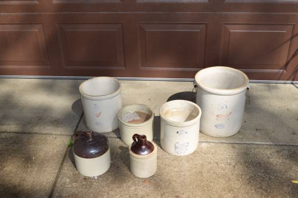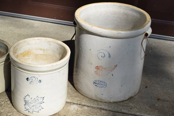 Six Crocks- sold as is. The Western Stoneware has 1 hairline crack. The #3 Redwing has 2 hairline Cracks. The 5 Redwing with the handle has 1 hairline crack. Other 3 0 cracks or other damage. Sold...