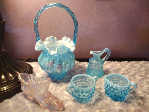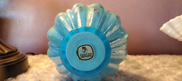 1. Fenton Art Glass Celeste blue overlay iridized handpainted w/ roses melon basket. Twisted glass handle with ruffled basket edge. Glossy iridized finish reflects beautifully. Handpainted decor goes all the way around the basket. Cased glass with a white interior to the basket.