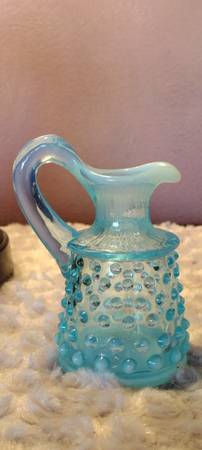 3. 1950's Fenton hobnail Cruet blue Opalescent glass with handle. Stopper is missing.